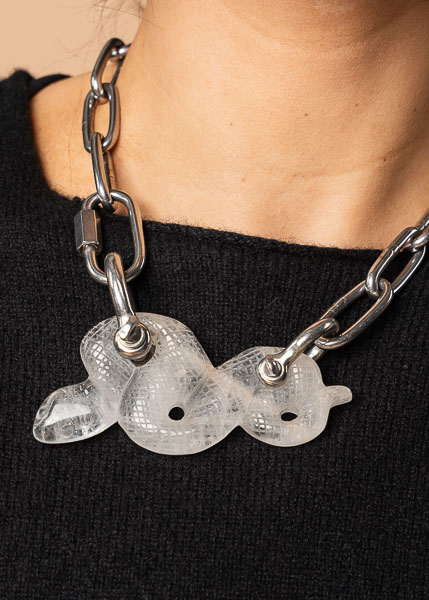 „Ich interessiere mich für die Geschichte von Menschen und ihre Beziehung zur Welt. Mich fasziniert die Synthese von Objekten, die scheinbar nicht zusammenpassen. Ich finde Schönheit im Chaos und Vergebung für Fehler. Dieses Konzept wird für mich nie alt, und so wie das Leben nicht so geordnet und zart wie eine Perlenkette ist, ist es auch mein Schmuck nicht.“